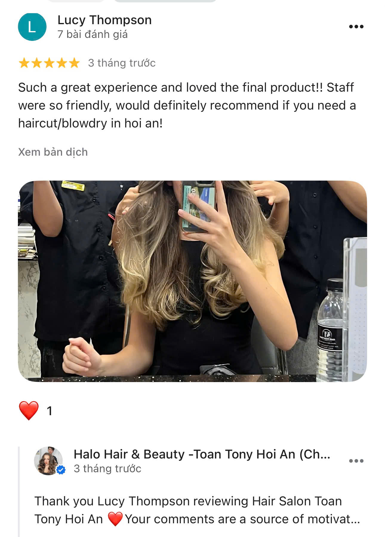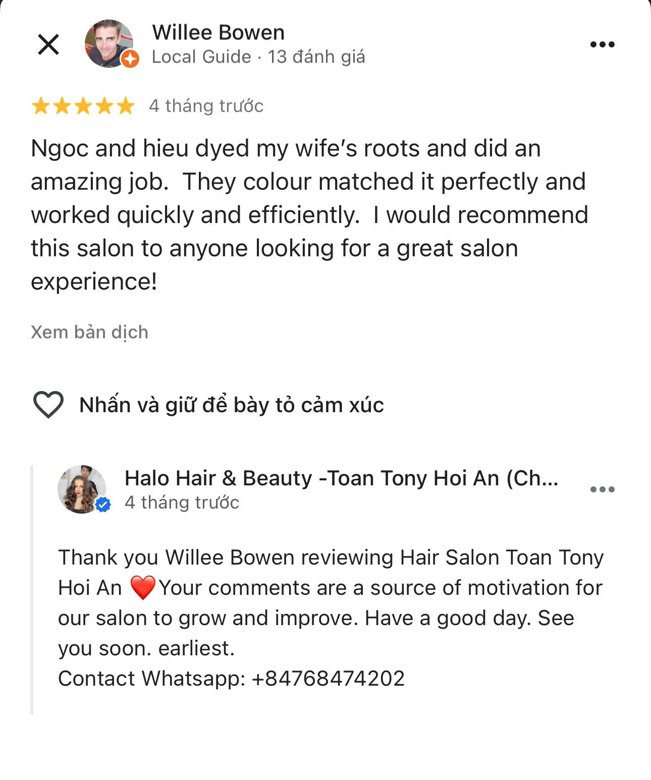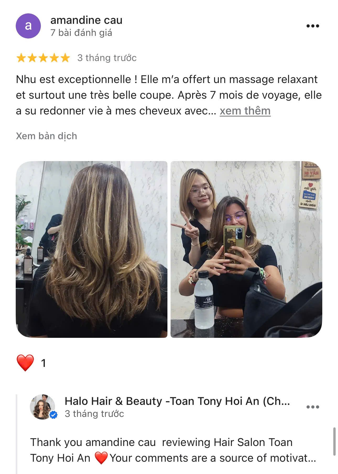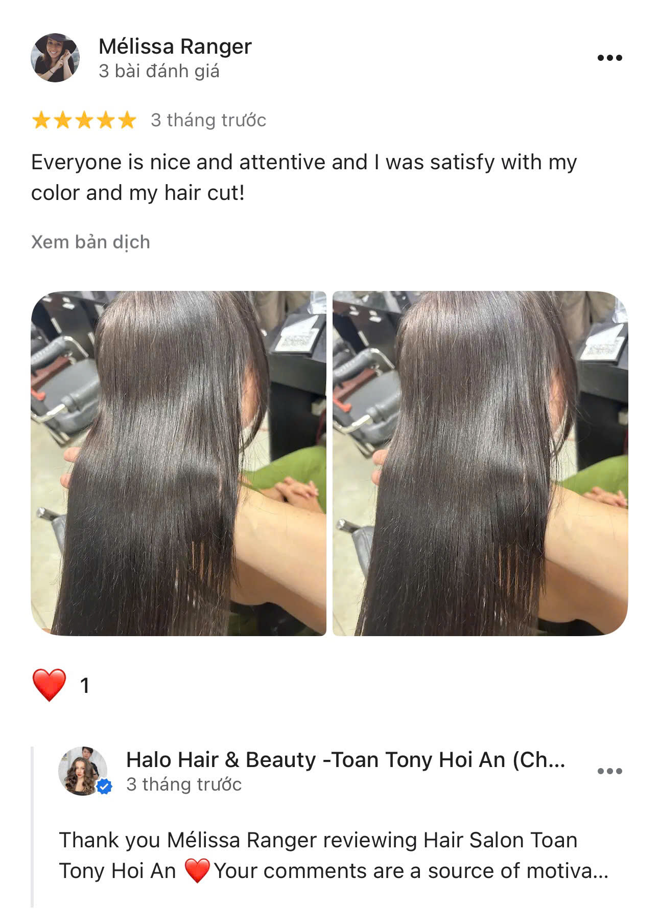 Một ngày tuyệt vời vì mình đã có được mái tóc đẹp như ý, cảm ơn đội ngũ Halo Hair & Beauty Hoi An rất nhiều