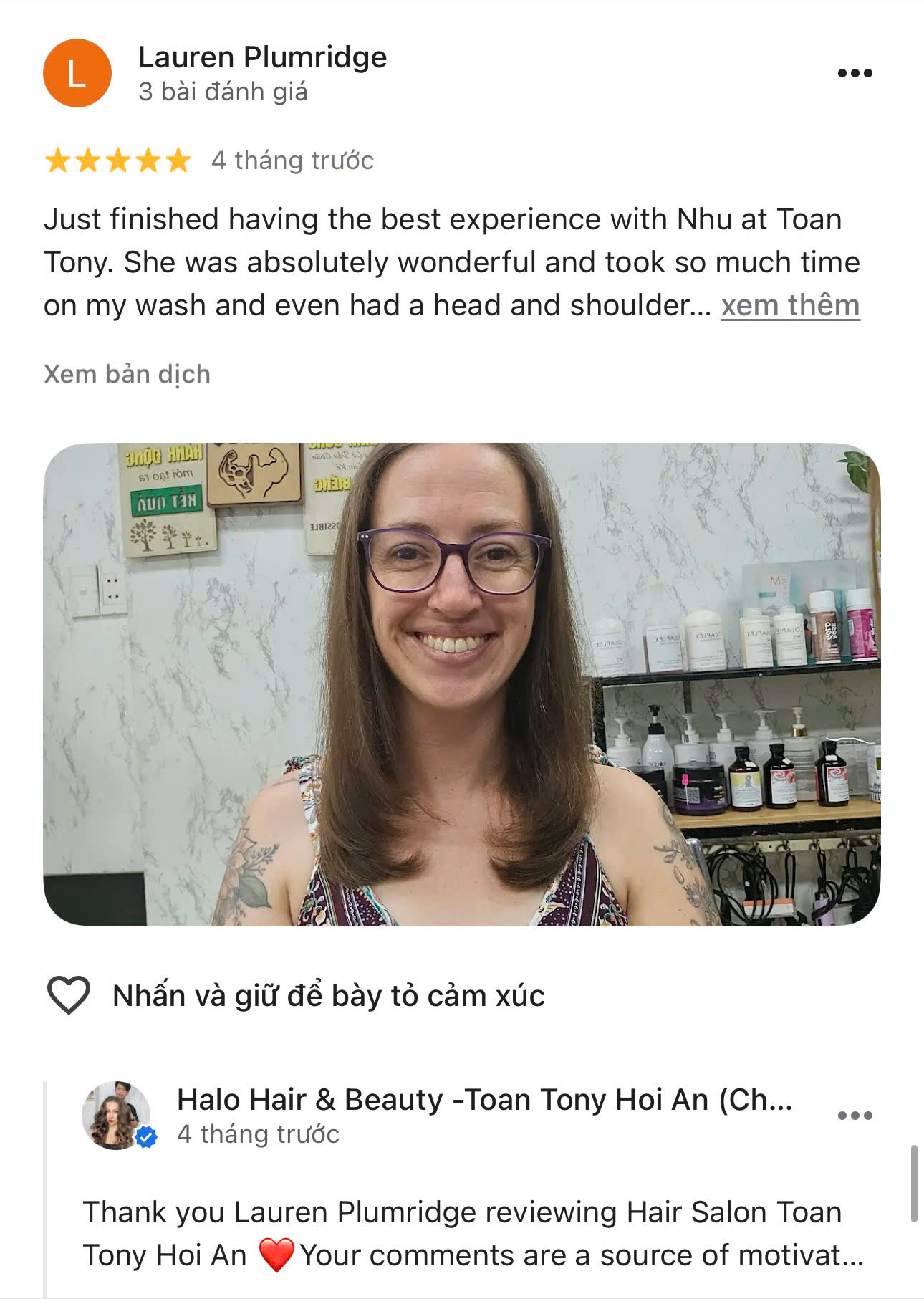 Hạnh phúc là được tự tin với mái tóc thật đẹp, thật óng ánh. Cảm ơn đội ngũ nhân viên tại Halo Hair & Beauty Hoi An đã luôn hỗ trợ mình mỗi lần đến